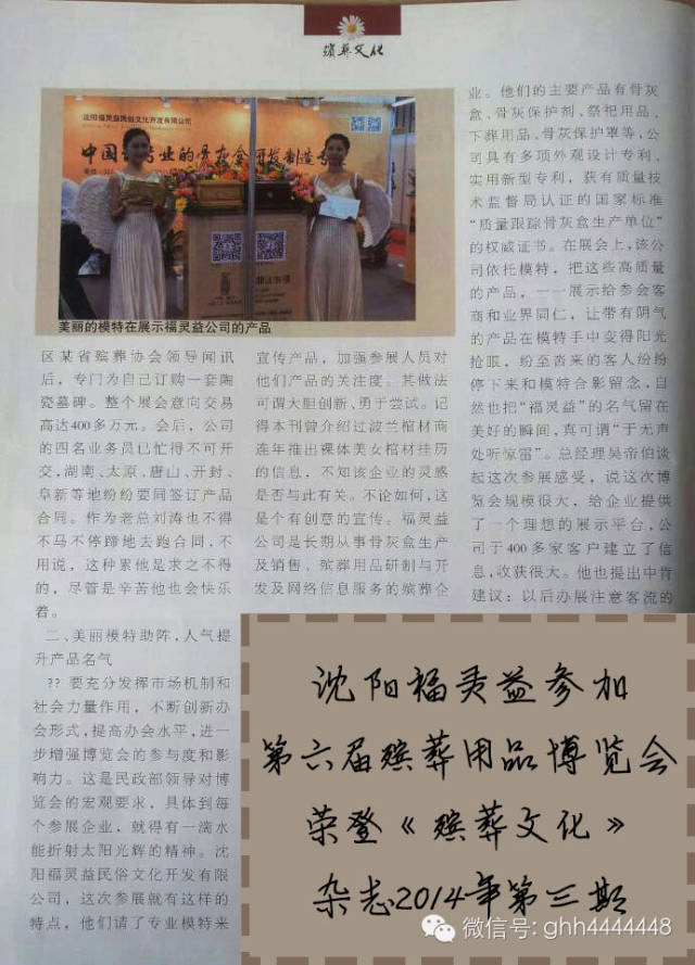 要充分发挥市场机制和社会力量作用,不断创新办会形式,提高办会水平,进一步增强博览会的参与度和影响力。这是民政部领导对博览会的宏观要求,具体到每个参展企业,就得有一滴水能折射太阳光辉的精神。沈阳福灵益民俗文化开发有限公司,这次参展就有这样的特点,他们请了专业模特来宣传传产品,加强参展人员对他们产品的关注度。其做法可谓大胆创新、勇于尝试。记得把本刊曾经介绍过波兰馆材商连年推出裸体美女棺材挂历的信息,不知该企业的灵感是否于此有关。不论如何,这是个有创意的宣传。福灵益公司是长期从事骨灰盒生产及销售、殡葬用品研制与开发及网络信息服务的殡葬企业。他们的主要产品有骨灰盒、骨灰保护剂、祭祀用品、下葬用品、骨灰保护罩等,公司具有多项外观设计专利、实用新型专利,获有质量技术监督局认证的国家标准“质量跟踪骨灰盒生产单位”的权威证书。在展会上,该公司依托模特,把这些高质量的产品,一一展示给参会客商和业界同仁,让带有阴气的产品在模特手中变得阳光抢眼,纷至沓来的客人纷纷停下来和模特合影留念,自然也把“福灵益”的名气留在美好的瞬间,真可谓“于无声处听惊雷”。总经理吴帝伯谈起这次参展感受,说这次博览会规模很大,给企业提供了一个理想的展示平台,公司与400多家客户建立了信息,收获很大。他也提出中肯建议:以后办展注意客流的分布,保持每天有稳定客源,不要拥挤在一天。(编辑:沈阳灵益www.4444448.com)