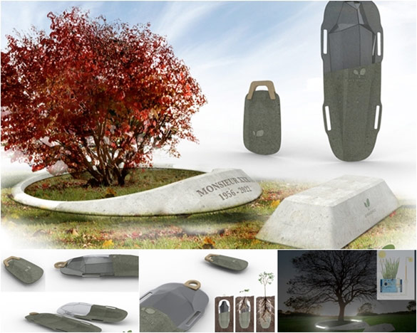 棺材中还预埋了发电系统,只要植物在生长就能够利用绿植和水分发电,供墓地上的LED灯使用,每到夜晚植物周边便自动亮起宁静而安逸的生命之光。这幅“生命轮回棺材”可以让我们生与死的转换变得更“华丽”更环保,也给我们落叶归根的情怀落下了完美的注脚,让死者在自然生态中得到日夜无尽的纪念。