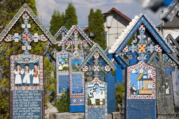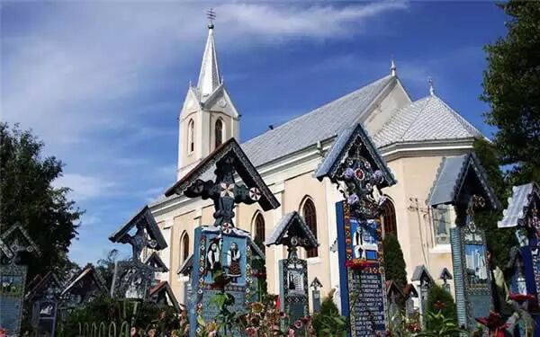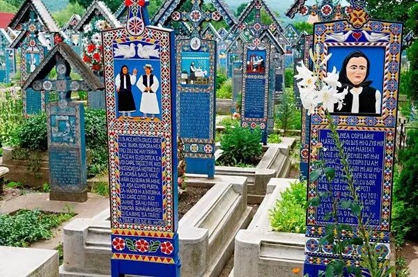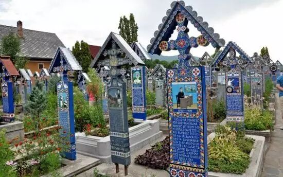 在这里拥有一座“快乐墓园”,里面坐落着约800个墓碑,墓碑上除了雕刻着逝者的画像,还会用鲜艳明亮的彩绘装饰点缀。墓碑上通常还刻着一些短小有趣的诗句作为墓志铭,用智慧与幽默的方式讲述死者的一生,有时甚至会揭露死者的一些糗事。